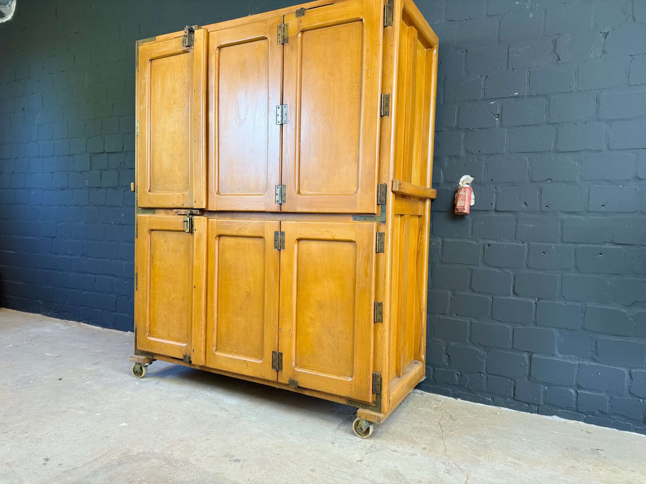 Alter Vintage Bäckereischrank aus den 30er Jahren, ein echtes Stück Handwerksgeschichte. Gefertigt aus massivem Buchen- und Kiefernholz überzeugt er durch seine robuste Bauweise und den besonderen Vintage-Charakter. Der Schrank verfügt über sieben herausziehbare Teigbretter, große Flügeltüren und steht auf Rollen, sodass er leicht bewegt werden kann.