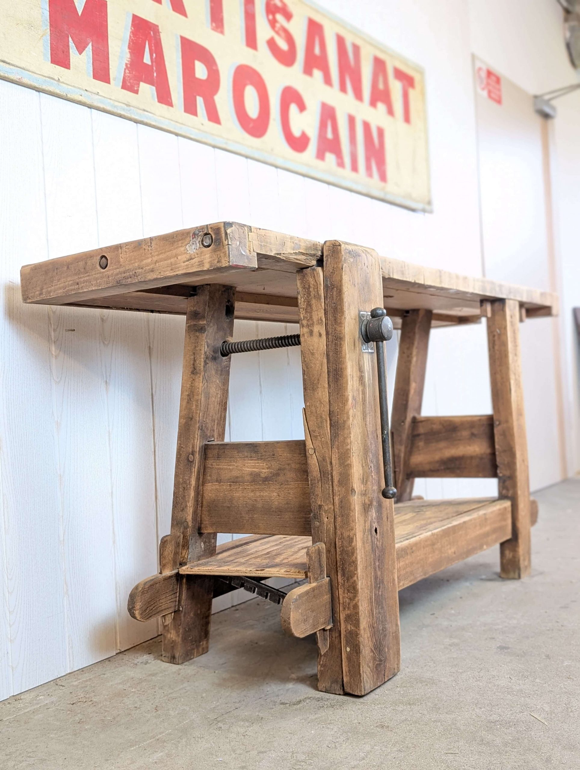 Entdecke diese außergewöhnliche antike französische Werkbank -/ Hobelbank aus massivem Buchenholz – ein echtes Liebhaberstück für Vintage- und Interior-Fans. Die wunderschöne Patina, die authentischen Gebrauchsspuren und die robuste Konstruktion machen dieses Möbel zu einem stilvollen Unikat mit Geschichte.
