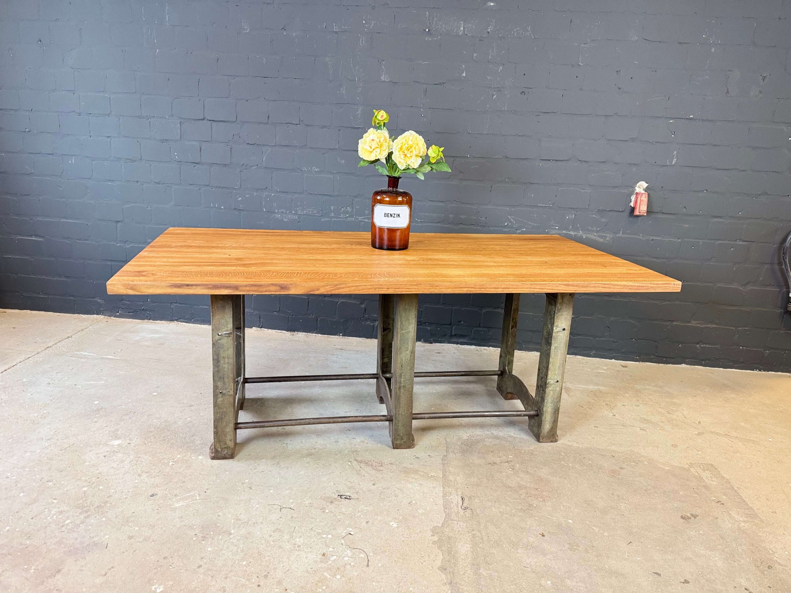 Einzigartiger Esstisch aus massivem Eichenholz mit originalem Stahl-Maschinengestell aus den 50er Jahren. Die alte Eichenholzplatte wurde sorgfältig neu aufgearbeitet und geölt, wodurch Maserung und Charakter perfekt zur Geltung kommen.